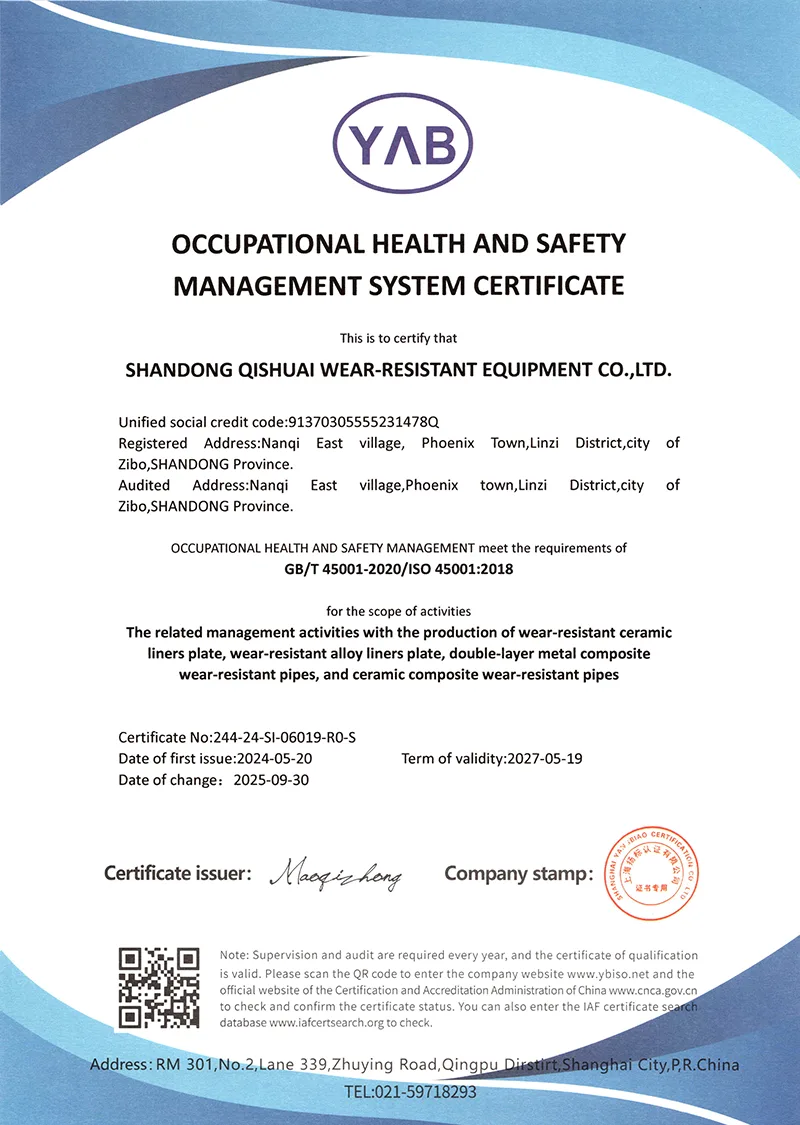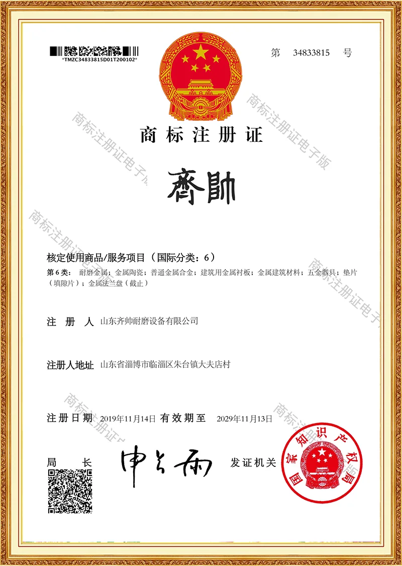 ISO9001 인증을 획득하고 다수의 실용신안 특허를 취득하며 기술력을 인정받고 있습니다. 우리는 자체 공장을 소유하고 있으며 10년 넘게 내마모성 제품 산업에 깊이 관여해 왔습니다.